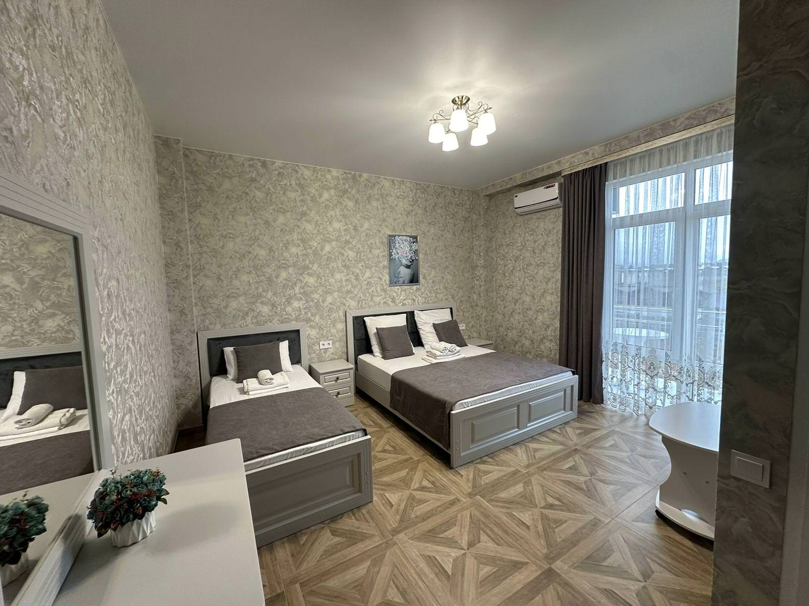 Улучшенный семейный номер. В номере двуспальная кровать, дополнительное место (оплата отдельно при заселении). В номере предоставляется - холодильник, кондиционер, сейф, телевизор, набор посуды, полный комплект полотенец, зубные наборы и тапочки. Номера с собственным балконом.